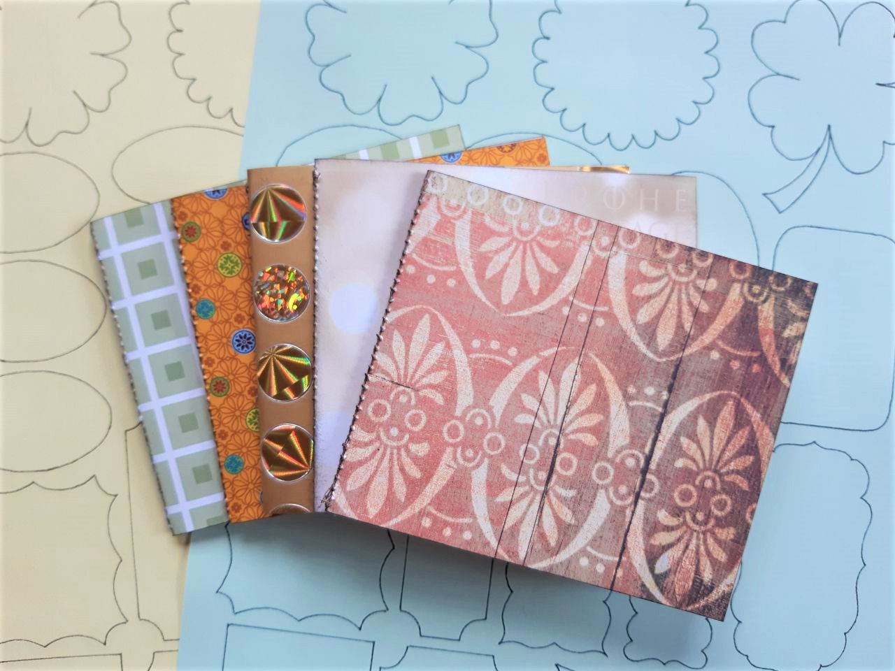 5 verschiedene dünne Minibüchlein in (nicht nur) Weihnachtsfarben, ganz besonders schön als erweiterte persönliche Grußkarte zur Weihnachtszeit, + 2 Bogen Etiketten pastellgelb und pastellgrün zum Ausschneiden