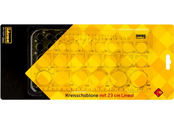 Kreisschablone mit 36 Kreisen bis 36 mm Durchmesser in 1-mm-Schritten, entlang des Randes zusätzlich ein Lineal